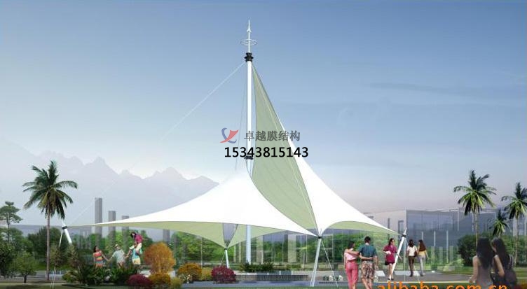 3.污漬:污漬也是在安徽張拉膜景觀中常見的疵病,特別是在早期選用PV膜材建成的一些張拉膜景觀.原因主要是在設(shè)于膜材外用PVC涂層隨時間推移老化/剝落所致.由于制作安裝缺陷導(dǎo)致膜面在焊接縫處留下污漬或不慎利物刮劃涂層,使織物直接接受紫外線的作用,時間久了也會出現(xiàn)局部污漬.