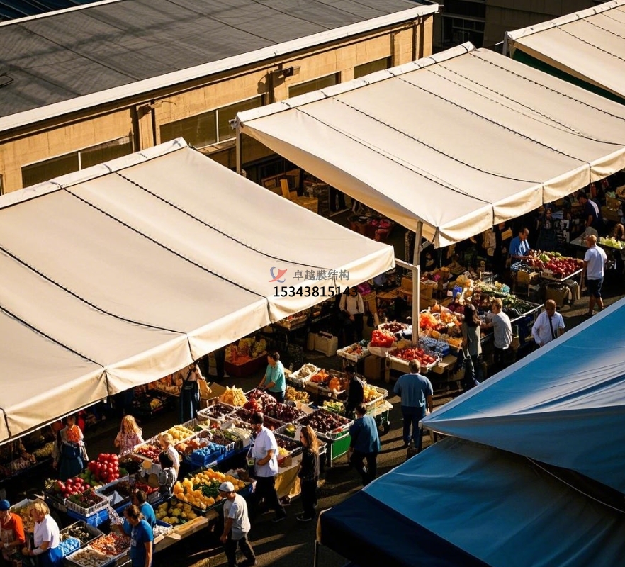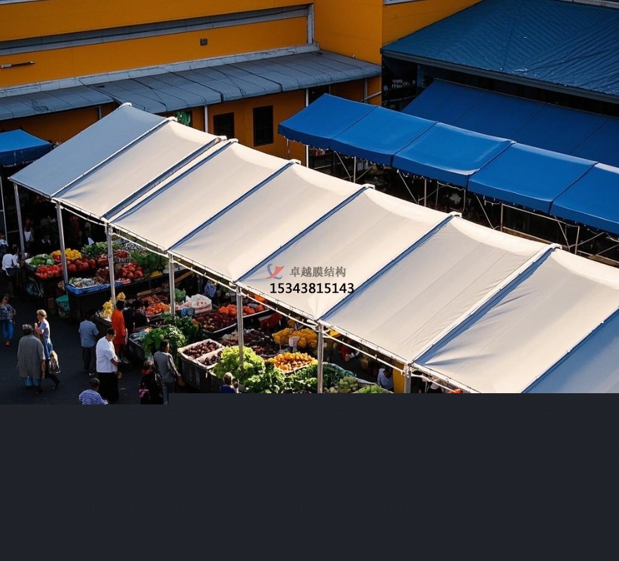 在城市的煙火氣味中,農(nóng)貿(mào)商場(chǎng)是不可或缺的存在,它承載著新鮮食材的匯聚與居民日常生活的快捷。但是,傳統(tǒng)農(nóng)貿(mào)商場(chǎng)頂棚在長(zhǎng)期運(yùn)用中暴露出許多問題,如年久失修易漏雨、空間布局局促、外觀陳腐等。膜結(jié)構(gòu)頂棚的出現(xiàn),宛如一陣清風(fēng),為農(nóng)貿(mào)商場(chǎng)帶來了全新的生機(jī)與革新。