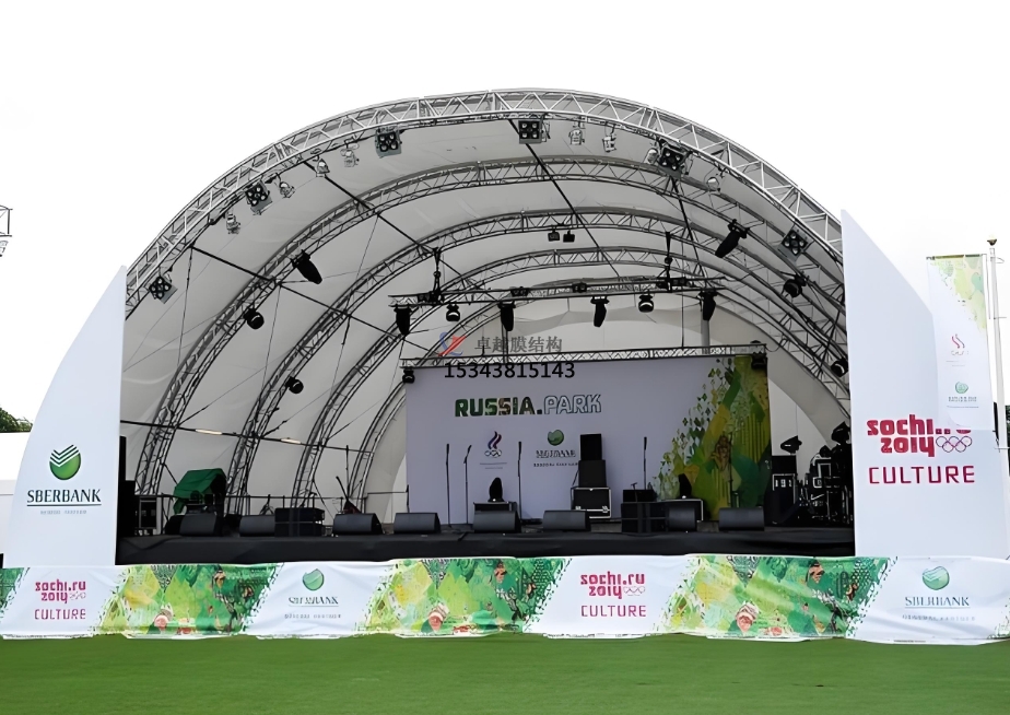 遮陽與避雨:對于野外舞臺而言,遮陽和避雨是非常重要的功能需求。膜結構舞臺可以有用地阻撓陽光直射和雨水侵襲,為藝人和觀眾供給一個舒適的環(huán)境。在酷熱的夏日,膜材可以阻撓部分紫外線,下降舞臺區(qū)域的溫度,避免藝人因高溫中暑,一起也讓觀眾在觀看扮演時愈加舒適。在雨天,膜結構可以避免雨水落在舞臺上,確保扮演設備不受損壞,藝人的扮演不受影響。