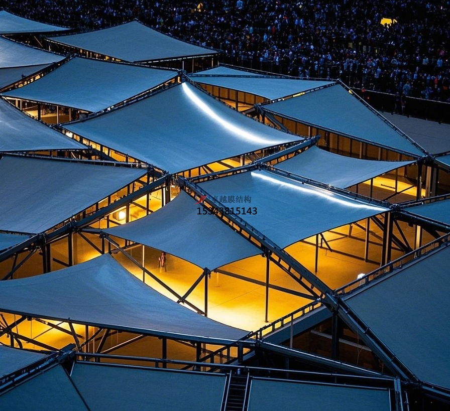 在各類演唱會、歌舞晚會、戲曲扮演等大型文藝扮演中,舞臺膜結構的運用極為廣泛。它可以依據(jù)扮演的主題和風格,規(guī)劃出與之相匹配的造型,為扮演營造出共同的氣氛。例如,在一場經(jīng)典歌劇的扮演中,舞臺膜結構采用了歐式古典修建風格的規(guī)劃,膜材外表的紋路和色彩模擬出古老修建的質感,調配精美的燈火作用,將觀眾帶入了歌劇所描繪的時代背景中,增強了扮演的藝術感染力。在流行音樂演唱會上,膜結構舞臺則常常規(guī)劃成賦有現(xiàn)代感和科技感的造型,經(jīng)過與燈火、音響等設備的配合,為歌手的扮演打造出炫酷的舞臺作用,滿足觀眾對視覺和聽覺的兩層享用。