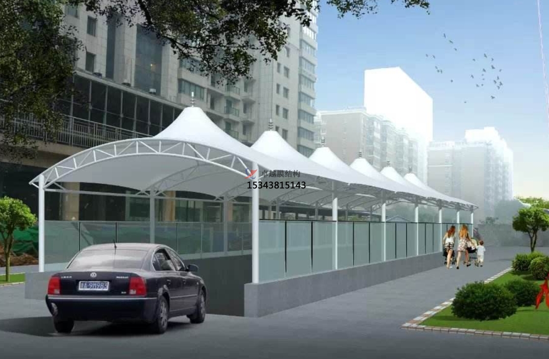車(chē)庫(kù)出入口膜結(jié)構(gòu)頂棚是一種現(xiàn)代化的建筑結(jié)構(gòu),它采用高強(qiáng)度、耐久性的膜材料,通過(guò)鋼骨架、拉索、張力桿等構(gòu)件,形成一種穩(wěn)定的空間形態(tài),用于車(chē)庫(kù)出入口的遮陽(yáng)和防護(hù)。這種結(jié)構(gòu)不僅具有良好的透光性和抗風(fēng)能力,而且設(shè)計(jì)簡(jiǎn)潔美觀,非常有現(xiàn)代感。