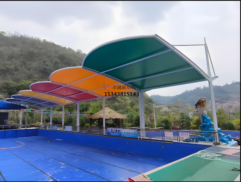 案例?。耗そY(jié)構(gòu)遮陽(yáng)棚采用PVC/PVDF材質(zhì),顏色豐富(如橙色、藍(lán)色),與綠植形成對(duì)比,提升公園藝術(shù)性。