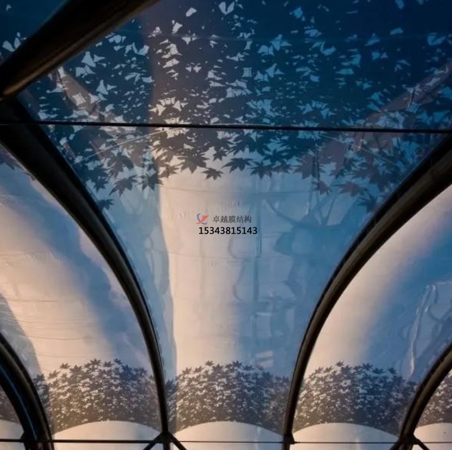 這里主要說一下使用最廣泛的透明加花紋鍍點(diǎn)膜。在透明膜上增加花紋鍍點(diǎn),目的是調(diào)節(jié)陽光的通過率,使屋面下的光照環(huán)境更舒適宜人。鍍點(diǎn)花紋的形狀、大小、排布間隔等,都是可以定制的。雖然膜材上加了鍍點(diǎn),但是當(dāng)屋面離地面10米以上時(shí),視覺中,鍍點(diǎn)屋面看起來幾乎是透明的。
