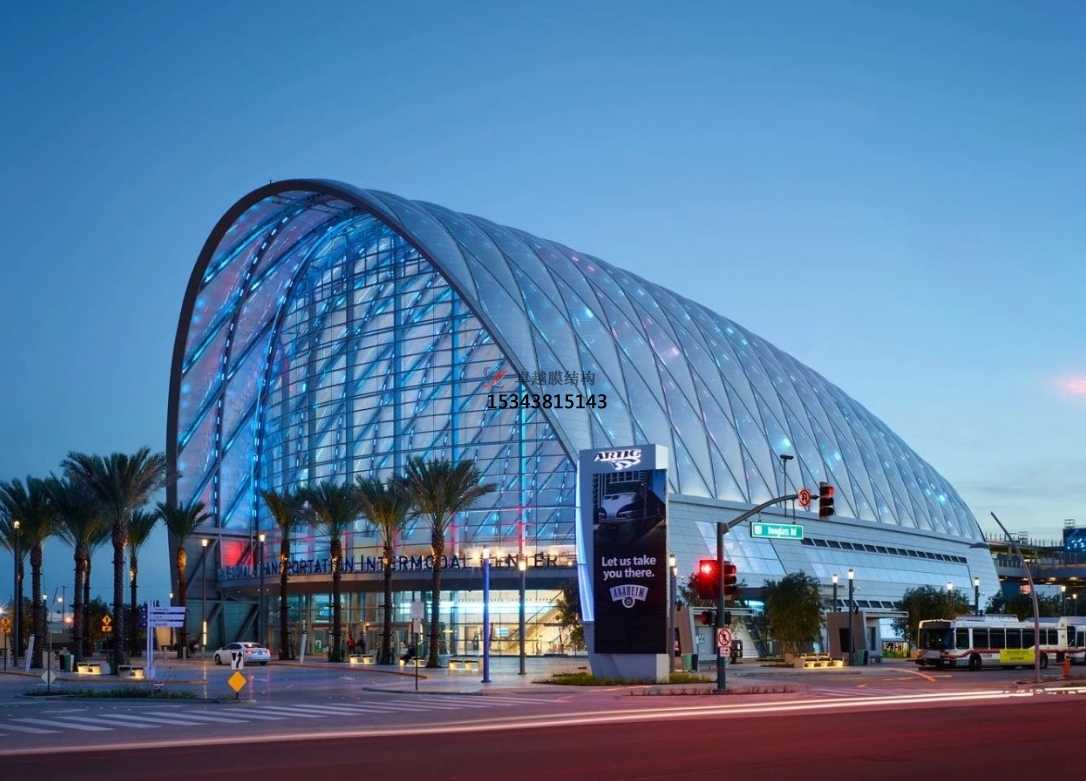 ETFE設(shè)計(jì)強(qiáng)度低,單層ETFE適用于跨度較小的結(jié)構(gòu),比較典型的應(yīng)用是設(shè)置于桁架弦桿之間,形成采光帶,且通過(guò)ETFE與PVC/PTFE不同材質(zhì)的組合使用,產(chǎn)生更為豐富的視覺(jué)效果。