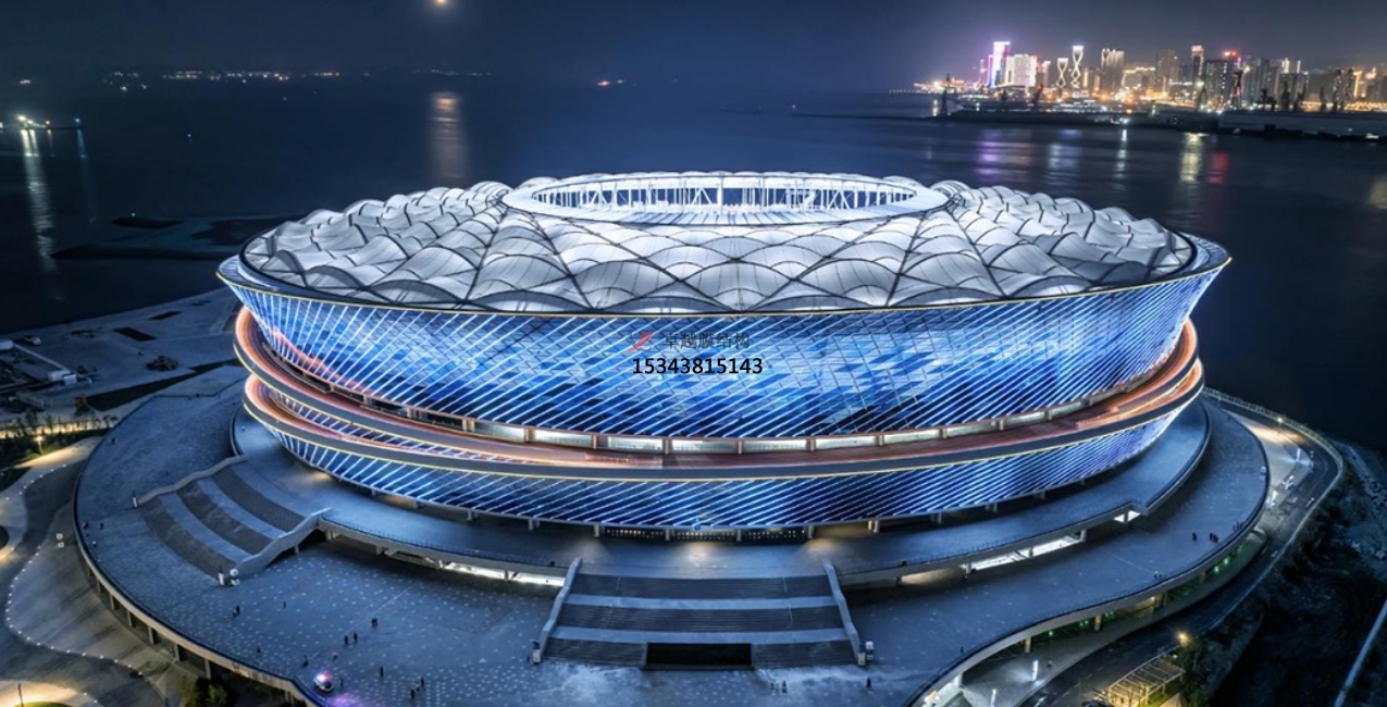 2022年,大連梭魚灣體育中心,立面使用德國(guó)NOWOFOL ETFE 9種不同藍(lán)色彩膜,頂面內(nèi)圈使用透明