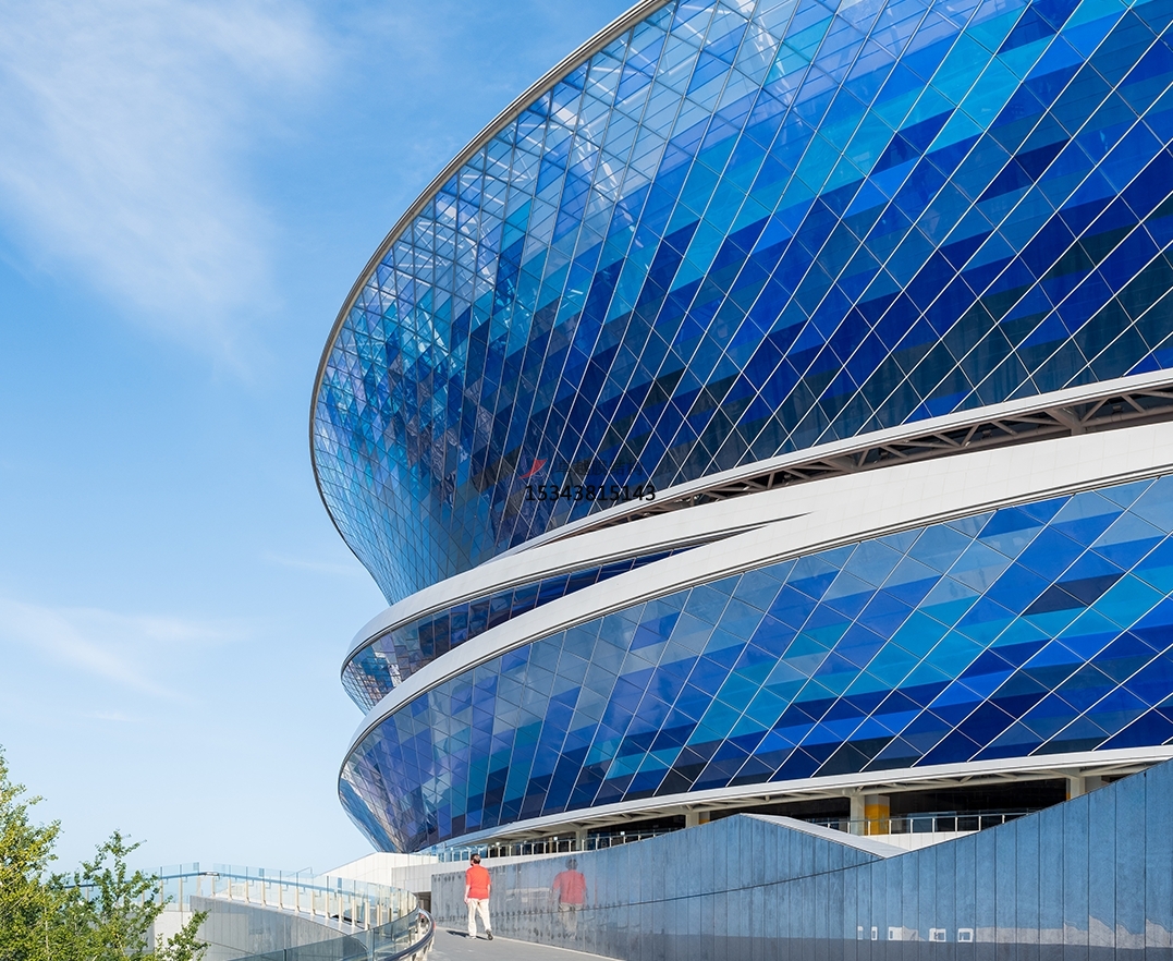 ETFE索膜結(jié)構(gòu)與環(huán)繞索膜泛光照明體系組成。其中,立面采用ETFE膜近4萬(wàn)平方米,包含9種藍(lán)色膜材、7823片膜片,是已知世界專業(yè)足球場(chǎng)膜結(jié)構(gòu)覆蓋面積最大,采用單層ETFE膜結(jié)構(gòu)最多的工程。模材料間設(shè)置縫隙,其中較寬縫隙寬度為12厘米,較窄縫隙寬度6厘米,致力于保證立面通風(fēng)效果(15%)、減小立面風(fēng)荷載的同時(shí),提高場(chǎng)內(nèi)空間風(fēng)熱環(huán)境舒適性。同時(shí)縫隙的設(shè)置能夠增強(qiáng)消防排煙效能,并提高安裝容錯(cuò)率。立面構(gòu)件的工廠化生產(chǎn)及裝配化施工,極大地加快了現(xiàn)場(chǎng)立面吊裝及調(diào)試時(shí)間。