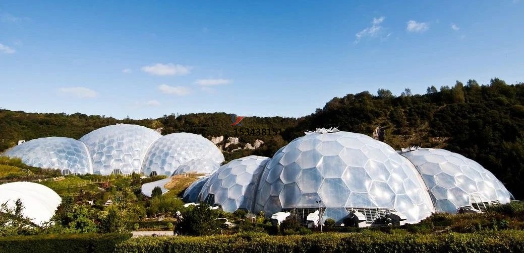“伊甸園”項目位于英國的康沃爾郡,是在廢棄的礦山上建的全球最大的生態(tài)溫室。主要由8個充滿未來主義色彩的巨大蜂巢式穹頂建筑構(gòu)成,其中每4座穹頂狀建筑連成一組。“伊甸園”的穹頂穹頂架由鋼管構(gòu)成,拼成尺寸9米大小的六角形天窗,天窗中間鋪設(shè)半透明的ETFE薄膜材料。在形態(tài)上像放大了無數(shù)倍的“大水泡”。"大水泡"里培育著原產(chǎn)于非洲、亞洲、歐洲、大洋洲和美洲的熱帶植物。