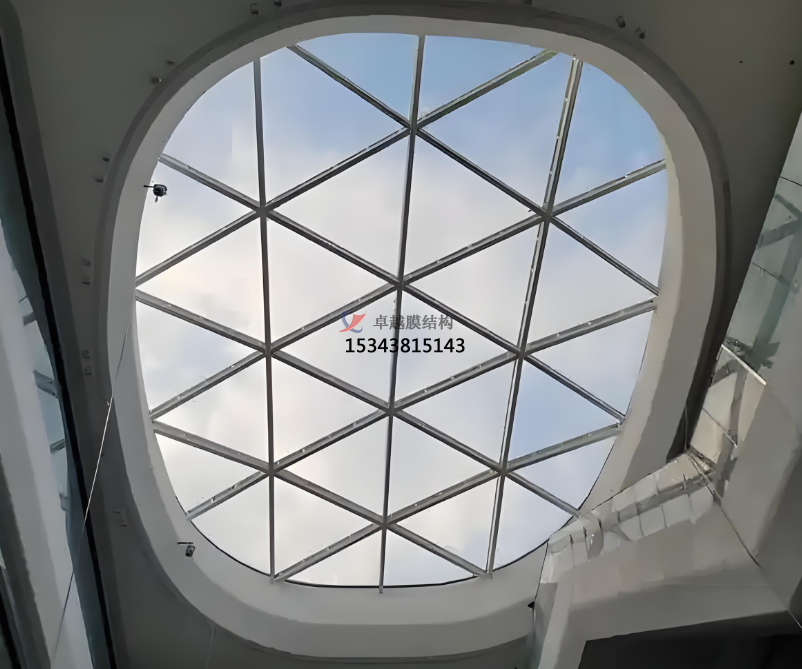 法國里昂匯流購物中心的菱形穹頂設(shè)計(jì)展現(xiàn)了 ETFE 膜的可塑性。36 米高鋼柱支撐的桁架拱與對角拱門形成網(wǎng)格結(jié)構(gòu),覆蓋 22,000 平方米的雙層 ETFE 氣枕,通過 LED 照明與膜面白點(diǎn)反射技術(shù),打造出動(dòng)態(tài)光影效果。這種將建筑美學(xué)與功能需求結(jié)合的設(shè)計(jì),凸顯了 ETFE 膜在復(fù)雜曲面造型中的優(yōu)勢。