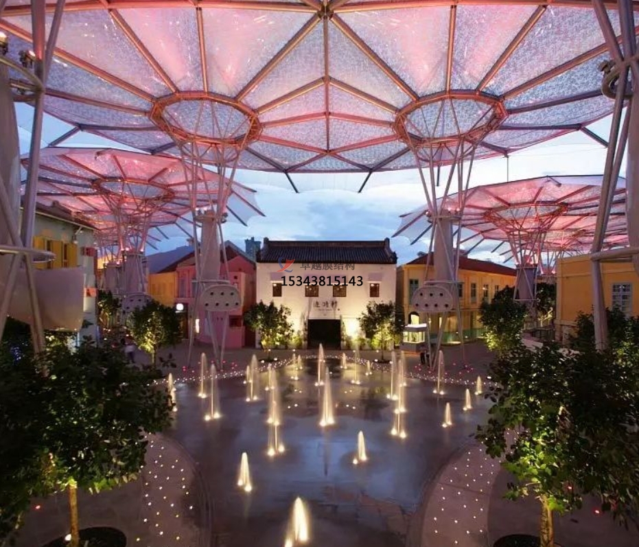 3、多功能性:除了遮陽功能外,膜結(jié)構(gòu)遮陽棚還可以作為陽雨棚、涼亭、連廊等使用。其構(gòu)思獨特、因地制宜的設(shè)計,使得遮陽棚在賦予景觀小品藝術(shù)化的同時,也將功能實用性融入其中,提升了游樂場的整體品質(zhì)。