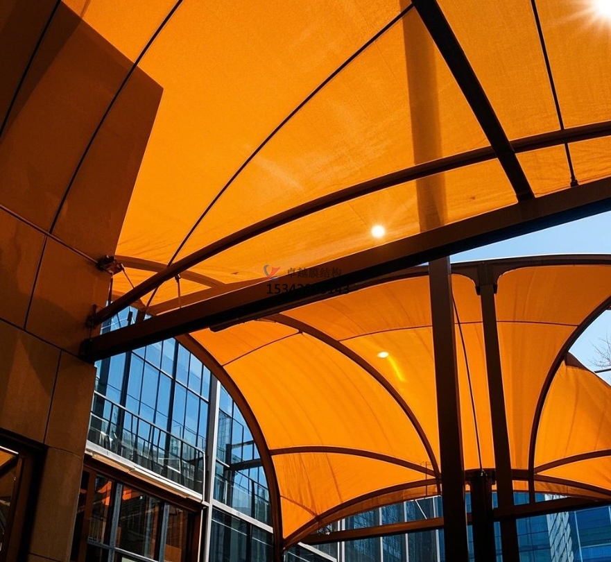 小區(qū)大門膜結(jié)構(gòu)選用的膜材具有出色的物理性能。首先,其防水性能極佳,能有效抵御各種惡劣天氣下的雨水侵襲,為進(jìn)出小區(qū)的居民遮風(fēng)擋雨,確保居民在雨天也能干爽通行。其次,膜材的抗紫外線能力很強(qiáng),能有效阻擋陽光中的有害紫外線,延緩膜材老化,保證大門長期使用后依然能保持良好的外觀和性能。這不僅延長了膜結(jié)構(gòu)大門的使用壽命,降低了維護(hù)成本,還為居民提供了一個(gè)防曬的過渡空間,減少了陽光直射對(duì)人體的傷害。