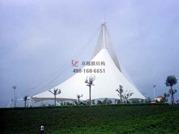 2、景觀膜結構是目前發(fā)展很快的一種新型空間結構,是一種效率極高的張力集成體系,可以充分發(fā)揮鋼索的強度與張拉整體結構的空間作用。它通過鋼骨架、鋼索與膜材共同受力形式穩(wěn)定曲面來覆蓋建筑空間,具有高度的形體可塑性和結構靈活性,即通過對膜材內部施加一定的預張力,使其具備了抵抗外荷載能力,從而充當結構材料的一種結構體系。我公司先后在六安地區(qū)承接了中央森林公園景觀、皋城中心廣場景觀、六安萬達廣場景觀小品的設計施工,簡介如下: