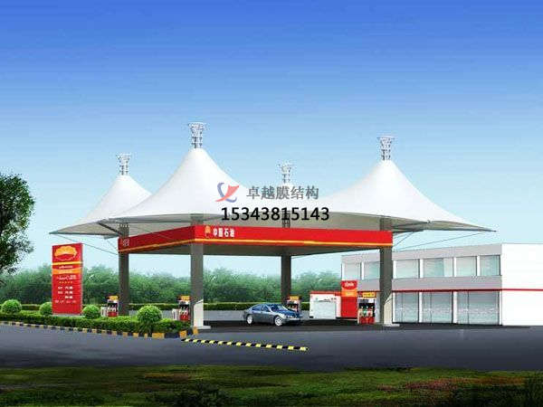 該加油站的膜結(jié)構(gòu)采用了高強度聚酯纖維材料,具有抗風(fēng)、防雨、防曬等特點。整個建筑造型流暢,外觀簡潔大方,充滿了現(xiàn)代感。在加油站內(nèi)部,客戶可以感受到更加舒適、便利的購物和休息環(huán)境。