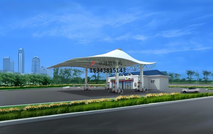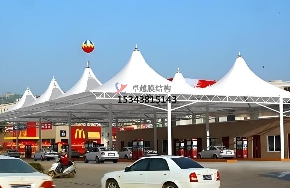 加油站張拉膜特點:造型美觀,透光性好,節(jié)能環(huán)保,抗震性強,施工便捷,經(jīng)濟性好。張拉膜結(jié)構(gòu)可通過獨特的曲面造型和豐富色彩,為加油站營造出現(xiàn)代、時尚的外觀,與周邊環(huán)境相融合,成為城市景觀的一部分。膜材具有較高的透光率,一般在 10%-20% 左右,部分可達 30% 以上,可提供自然采光,減少白天人工照明需求,節(jié)約能源。透光膜材可引入自然光減少照明能耗,結(jié)合自然通風設(shè)計降低空調(diào)使用率,材料可回收性符合綠色建筑標準,張拉膜具有良好的保溫隔熱性能,能有效降低加油站內(nèi)部能耗,配合節(jié)能照明設(shè)備,可實現(xiàn)綠色環(huán)保目標。自重輕、柔性大,在風荷載、雪荷載等外部荷載作用下,能通過變形分散荷載,具有良好的抗震性能,可抵抗 8 級地震。加油站膜結(jié)構(gòu)大部分構(gòu)件在工廠預(yù)制完成,現(xiàn)場組裝和安裝速度快,施工周期可比傳統(tǒng)建筑方式縮短一半以上,且對環(huán)境影響小,膜材料重量輕但強度高,降低支撐結(jié)構(gòu)負荷,安裝周期短,減少對加油站運營的影響。張拉膜結(jié)構(gòu)廣泛應(yīng)用于加油站頂棚設(shè)計,覆蓋加油區(qū)和洗車區(qū)域,為車輛及人員提供遮陽、防雨、防雪的全天候保護。在高速公路服務(wù)區(qū)、城市主干道等車流量密集區(qū)域,部分加油站結(jié)合張拉膜結(jié)構(gòu)擴展服務(wù)功能,例如設(shè)置司機休息區(qū)、戶外餐飲區(qū)或小型便利店,通過靈活的空間布局提升用戶體驗,其高效覆蓋能力尤為突出。雖然膜材和鋼結(jié)構(gòu)等材料成本相對較高,但由于施工周期短、維護成本低,長期來看綜合成本具有優(yōu)勢,且使用壽命可達 15-30 年甚至更長。