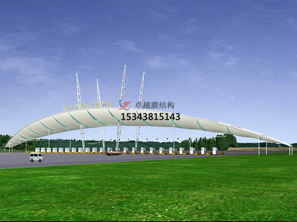 收費站膜結(jié)構(gòu),荷載態(tài)分析:張拉膜結(jié)構(gòu)自身重量很輕,僅為鋼結(jié)構(gòu)的1/5,混凝土結(jié)構(gòu)的1/40;因此膜結(jié)構(gòu)對地震力有良好的適應(yīng)性,而對風(fēng)的作用較為敏感。此外還要考慮雪荷載和活荷載的作用。
