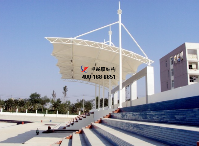 膜結構看臺,周口體育場膜結構看臺頂棚,膜結構看臺雨棚,操場主席臺遮陽棚等張拉形式膜結構的先行者是德國的奧托(F.Otto),他在1955年設計的張拉膜結構跨度在25m左右,用于聯(lián)合公園多功能展廳。