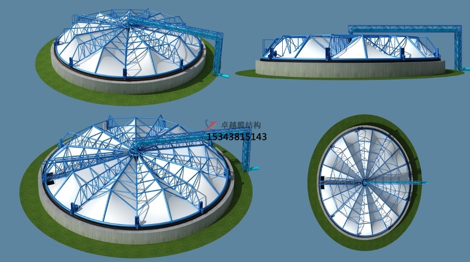 污水處理池加蓋,也稱反吊膜封閉,與常規(guī)建筑膜結(jié)構(gòu)不同之處在于,鋼構(gòu)在外部做支撐結(jié)構(gòu),膜材安裝在內(nèi)部做防護密閉,此類膜材采用污水池專用材料,具有防腐蝕、抗老化、免維護、美觀耐久、經(jīng)濟適用等優(yōu)點。