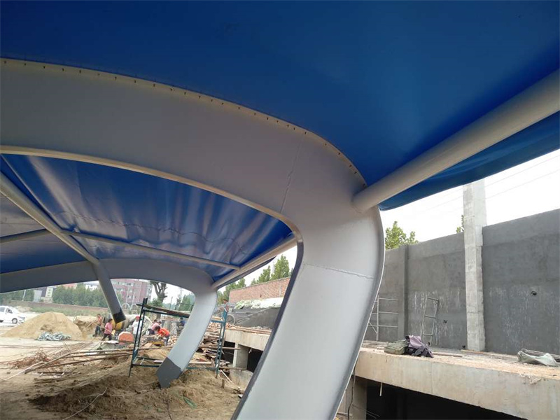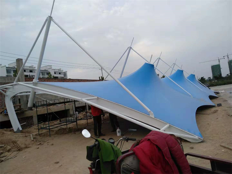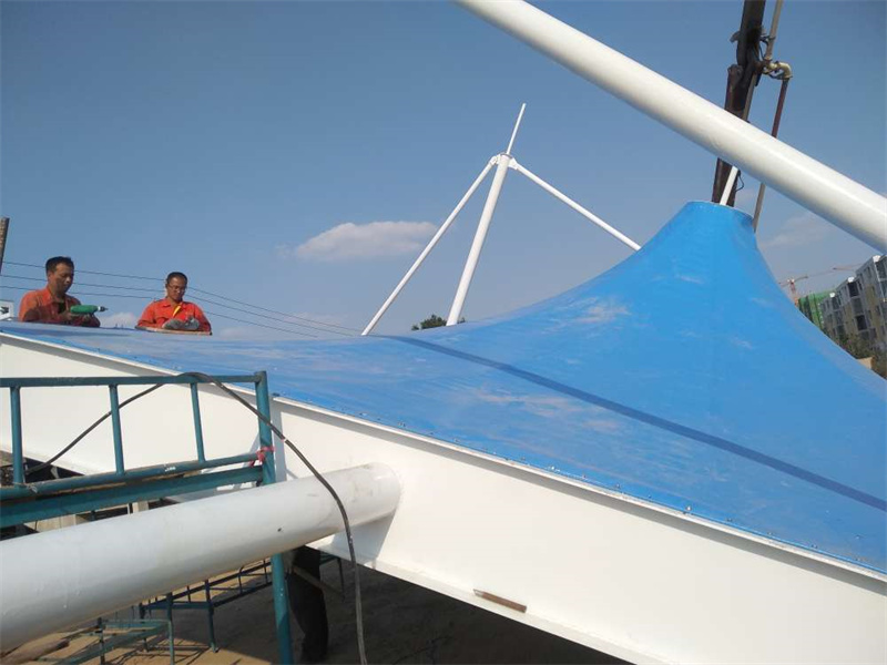 對邊角及有褶皺的區(qū)域進行局部張拉調節(jié),并更終固定膜面及節(jié)點;完成雨水系統(tǒng)安裝及防水覆蓋等;