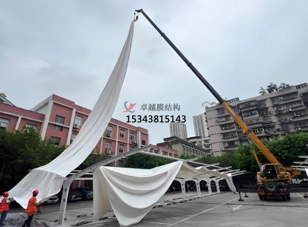 安裝過(guò)程:安裝過(guò)程分別是鋼結(jié)構(gòu)的安裝,膜材的安裝和附件安裝。鋼結(jié)構(gòu)的安裝會(huì)根據(jù)設(shè)計(jì)要求進(jìn)行鋼結(jié)構(gòu)基礎(chǔ)的施工,確?;A(chǔ)的尺寸、位置、標(biāo)高符合設(shè)計(jì)要求,做到表面光滑、無(wú)變形、無(wú)損傷。鋼結(jié)構(gòu)的安裝位置必須準(zhǔn)確,將鋼結(jié)構(gòu)構(gòu)件在地面進(jìn)行預(yù)組裝,檢查各構(gòu)件的連接是否準(zhǔn)確、牢固,使用專(zhuān)業(yè)的吊裝設(shè)備,如起重機(jī)等,按照預(yù)定的吊裝方案進(jìn)行操作,確保鋼結(jié)構(gòu)的安裝位置準(zhǔn)確。要隨時(shí)進(jìn)行測(cè)量和調(diào)整,保證鋼結(jié)構(gòu)的垂直度、水平度和跨度等符合設(shè)計(jì)要求。采用焊接、螺栓連接等方式將鋼結(jié)構(gòu)構(gòu)件連接固定,確保連接的強(qiáng)度和可靠性。焊接時(shí),要嚴(yán)格控制焊接質(zhì)量,避免出現(xiàn)焊接缺陷。膜材的安裝過(guò)程,膜面的尺寸和形狀必須符合設(shè)計(jì)要求,表面干凈、無(wú)損傷。膜材在安裝現(xiàn)場(chǎng)按照預(yù)定的方向和位置展開(kāi),同時(shí)應(yīng)注意避免膜材與地面或其他物體摩擦、劃傷。使用專(zhuān)用的夾具或繩索將膜材固定在鋼結(jié)構(gòu)上,初步調(diào)整膜材的位置,使其與鋼結(jié)構(gòu)的連接點(diǎn)對(duì)齊。進(jìn)行逐步且均衡的膜面張拉,張拉過(guò)程要均勻、緩慢地進(jìn)行,施加適當(dāng)?shù)念A(yù)張力,同時(shí)要根據(jù)膜材的實(shí)際情況,對(duì)張拉力進(jìn)行適當(dāng)?shù)恼{(diào)整,保證膜材表面平整、光滑,無(wú)褶皺、松弛等現(xiàn)象,使其達(dá)到設(shè)計(jì)要求。在膜材張拉到位后,使用專(zhuān)用的固定件將膜材牢固地固定在鋼結(jié)構(gòu)上。固定件的間距和安裝方式要符合設(shè)計(jì)要求,確保膜材在使用過(guò)程中不會(huì)出現(xiàn)松動(dòng)或位移。附件安裝,附件的安裝包括排水系統(tǒng)安裝,遮陽(yáng)設(shè)施安裝和安全設(shè)施安裝。安裝膜結(jié)構(gòu)的排水槽、落水口等排水設(shè)施,確保雨水能夠順利排出,避免在膜面形成積水。排水系統(tǒng)的安裝要保證密封性和排水順暢性。如果膜結(jié)構(gòu)設(shè)計(jì)有遮陽(yáng)要求,安裝相應(yīng)的遮陽(yáng)簾、遮陽(yáng)網(wǎng)等遮陽(yáng)設(shè)施。遮陽(yáng)設(shè)施的安裝要牢固可靠,能夠滿(mǎn)足遮陽(yáng)和使用功能的要求。安裝必要的安全設(shè)施,如欄桿、安全網(wǎng)等,確保人員在膜結(jié)構(gòu)區(qū)域內(nèi)的安全。