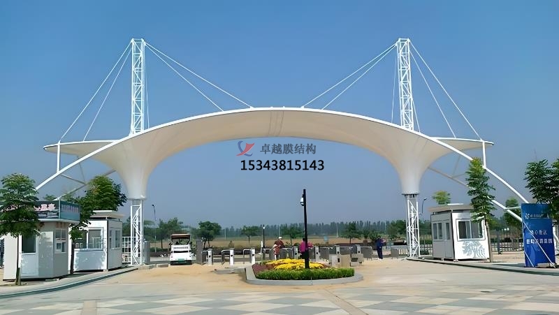 膜結(jié)構(gòu)出入口是一種以高強(qiáng)度膜材料與支撐結(jié)構(gòu)(鋼索、鋼架等)結(jié)合的建筑形式,具有輕盈、美觀、耐用等特點(diǎn),廣泛應(yīng)用于各種場所的建筑形式,主要用于提供遮陽、遮雨的功能,同時(shí)具有較高的觀賞性和藝術(shù)感。