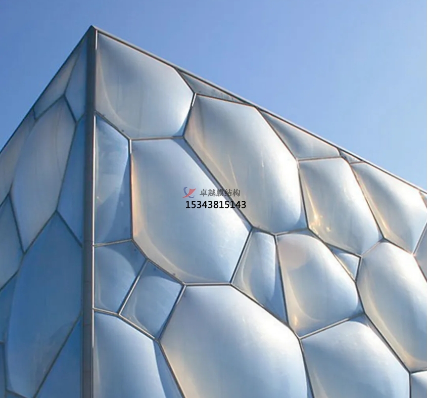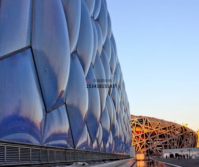 基于“泡沫”的設(shè)計(jì)靈感,設(shè)計(jì)師為“方盒子”包裹上了一層建筑外皮,上面布滿了酷似水分子結(jié)構(gòu)的幾何形狀;通過(guò)覆蓋的ETFE 透明膜賦予了建筑冰晶狀的外貌,使其具有獨(dú)特的視覺(jué)效果和感受,輪廓和外觀因此變得柔和,水的神韻在建筑中得到了完美的體現(xiàn)。