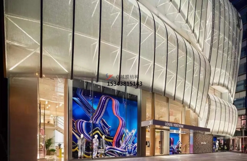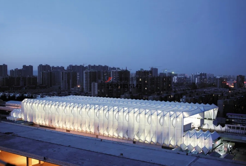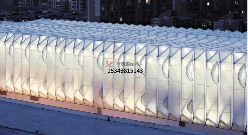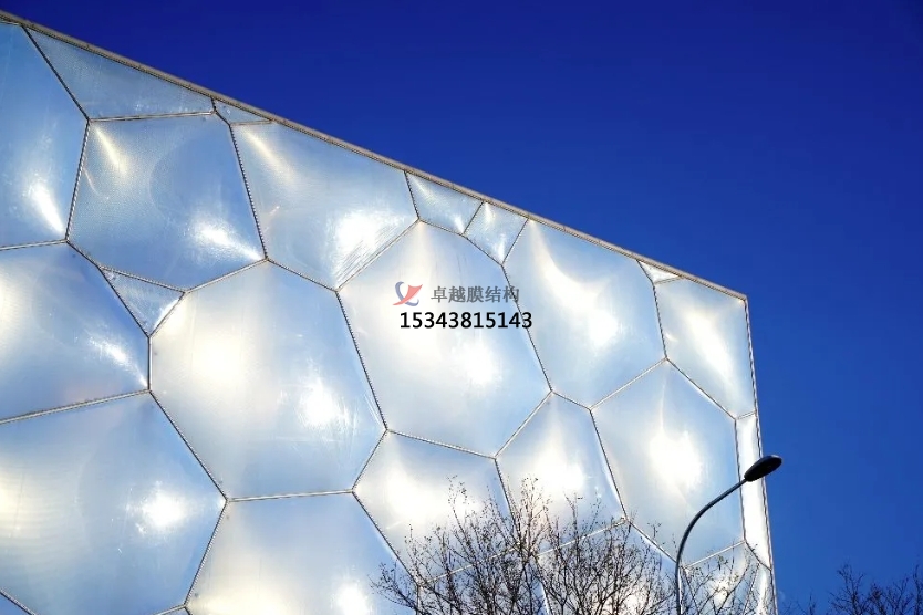 膜結(jié)構(gòu)使得建筑輕盈感十足,膜材料的良好透性使得建筑界面透光而不透視。由于該材料(ETFE)氣枕在陽(yáng)光底下富有通透感光線可以通過(guò)漫射和折射進(jìn)入界面,讓膜結(jié)構(gòu)建筑呈現(xiàn)出朦朧夢(mèng)幻之美。