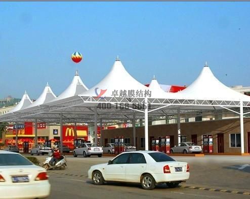 項目結(jié)構(gòu)形式:骨架式膜結(jié)構(gòu)加油站加氣站,四面自然排水,一側(cè)與站房搭接。