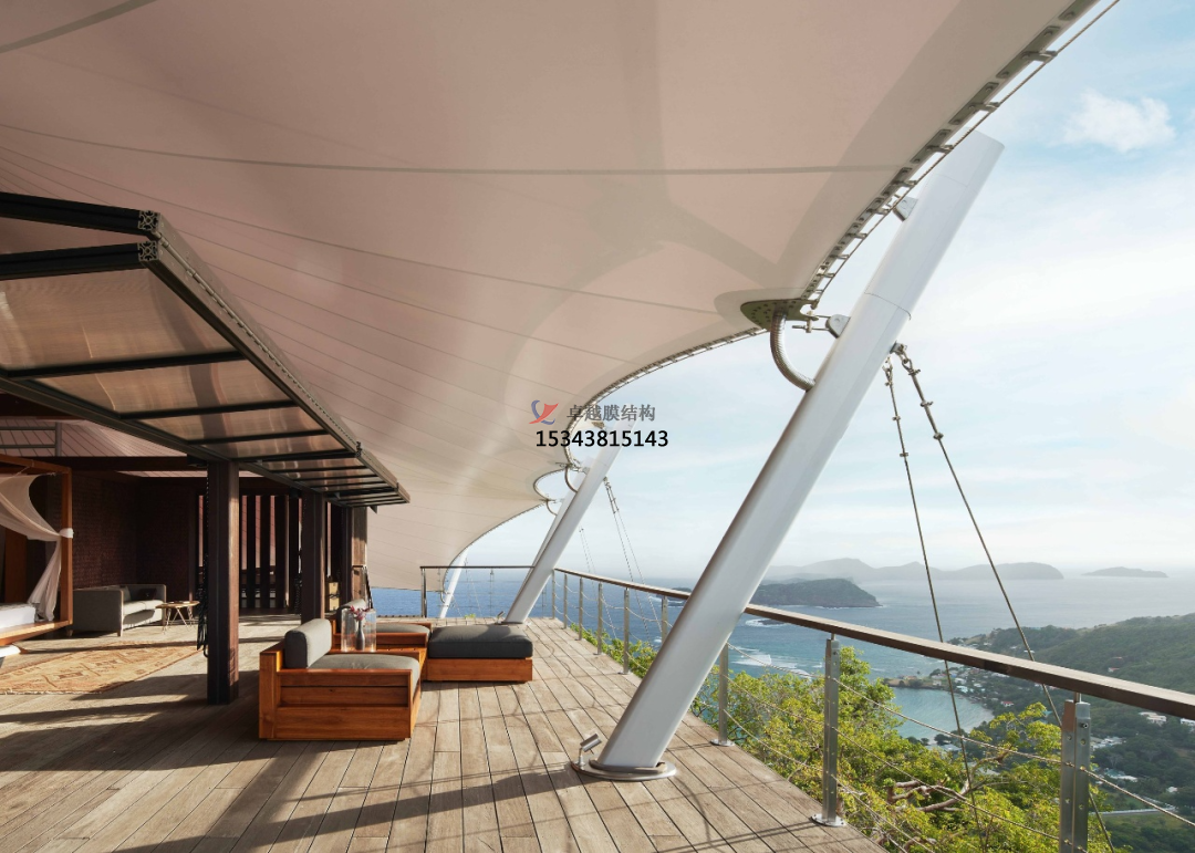 1.張拉膜結(jié)構(gòu):以膜材、鋼索及支柱構(gòu)成,利用鋼索與支柱在膜材中導(dǎo)入張力以達(dá)安定的形式,是最能展現(xiàn)膜結(jié)構(gòu)精神的構(gòu)造形式。