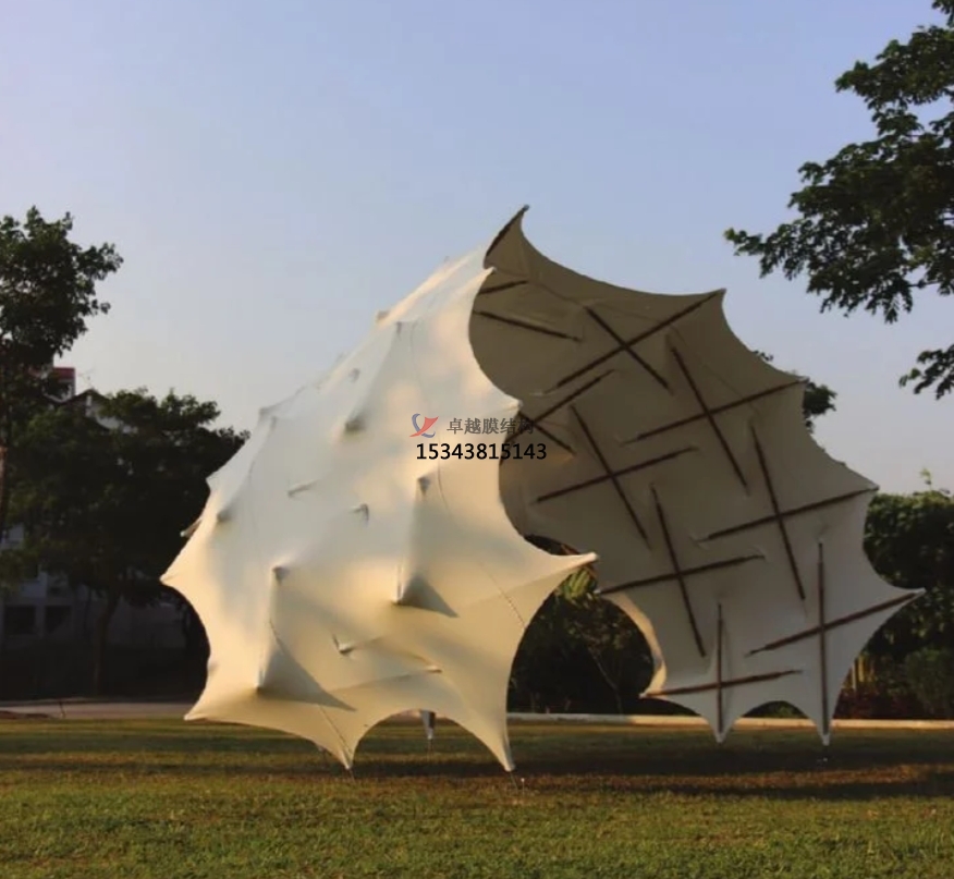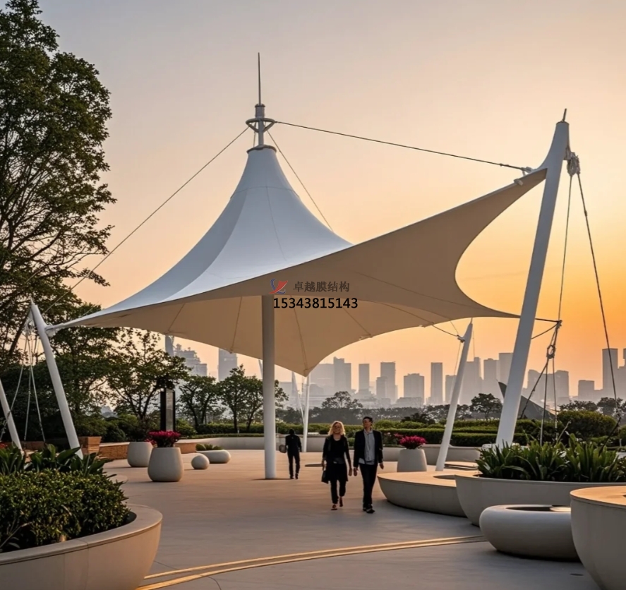 輕質(zhì)高強(qiáng),穩(wěn)固耐用:景觀膜結(jié)構(gòu)采用的高強(qiáng)度薄膜材料,重量僅約為傳統(tǒng)建筑結(jié)構(gòu)材料的十分之一,極大地減輕了自身重量。但 “輕量級” 的它卻有著超乎想象的強(qiáng)大實(shí)力,拉伸強(qiáng)度極高,在面對風(fēng)荷載與雪荷載時,能憑借出色的韌性與剛性,展現(xiàn)卓越的穩(wěn)定性。在強(qiáng)風(fēng)天氣中,膜結(jié)構(gòu)可通過自身的柔性變形來緩沖風(fēng)力,避免因剛性抵抗而導(dǎo)致結(jié)構(gòu)損壞;面對積雪,其合理的造型與支撐設(shè)計能使積雪均勻分布或自然滑落,防止因積雪過重造成坍塌,為景觀設(shè)施提供可靠的安全保障。