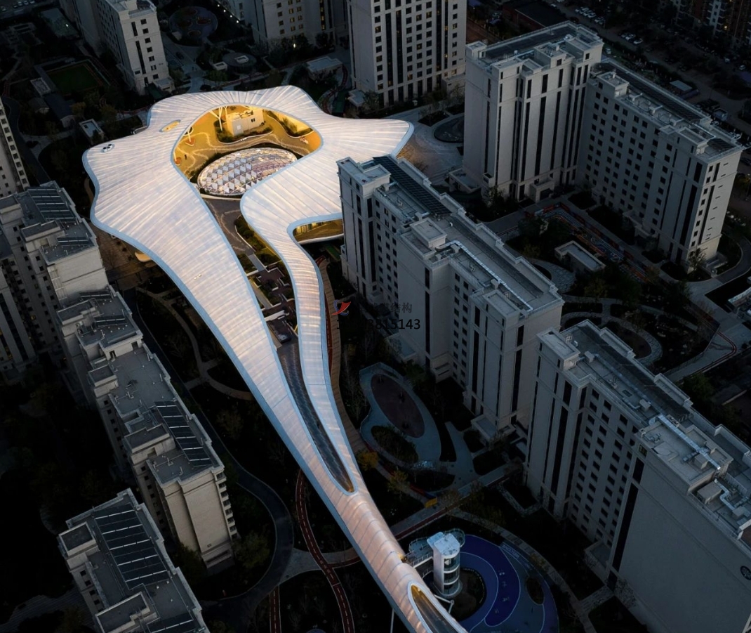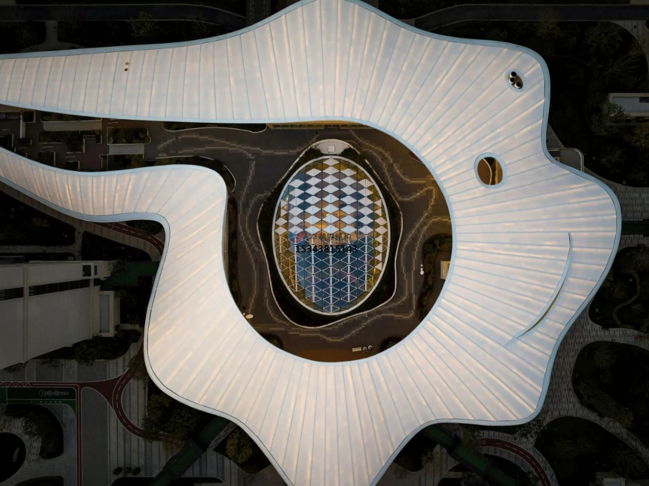 相對(duì)于四周規(guī)則的建筑形態(tài),活力中心呈現(xiàn)更加自由和充滿(mǎn)活力的有機(jī)形態(tài):如一顆水珠滴落,在場(chǎng)地中激起漣漪,自中心散開(kāi)、升騰,形成一片白色、柔軟的云朵,最終轉(zhuǎn)化為自由的大屋頂。