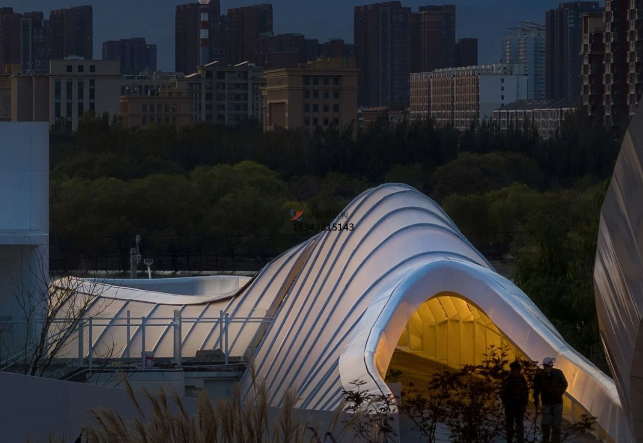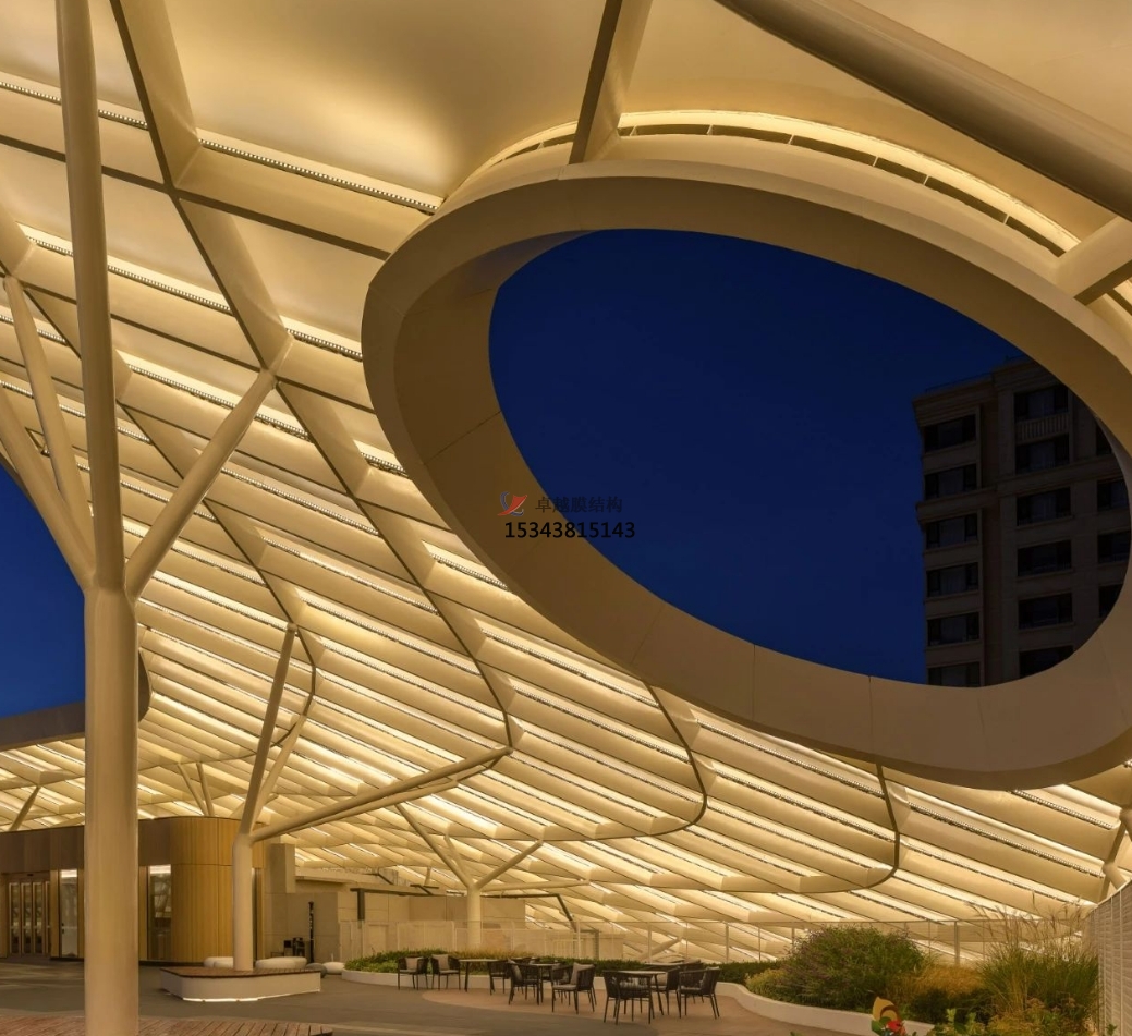 該半透明法拉利進(jìn)口PTFE膜材,遮陽(yáng)防水,自然采光,既可以保證日間二層屋頂花園能夠有充分光照,夜間也可利用膜的反射來(lái)提供屋頂花園的照明功能需求。