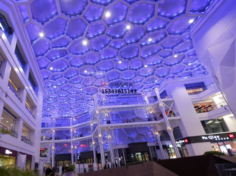 特點(diǎn):商業(yè)街膜結(jié)構(gòu)穹頂天幕特點(diǎn):透光性好、材質(zhì)輕、適合大跨度,可以完美取代傳統(tǒng)的穹頂材料,而且使用壽命更長、自潔性更佳、安全性更高。