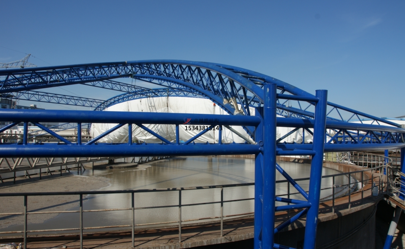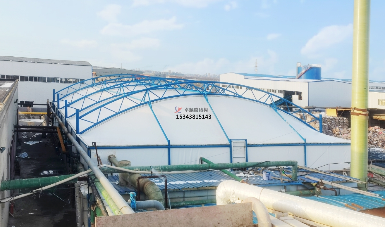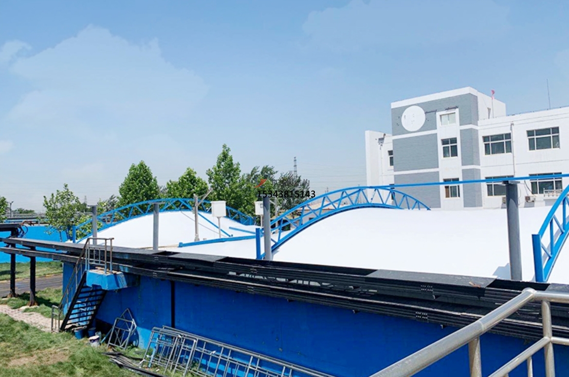 污水池反吊膜技術(shù)是一種利用膜材反吊的原理,將鋼結(jié)構(gòu)在外將膜材懸吊,利用膜材的氣密性特點,將廢氣密封在一個密閉的空間,進而將凈化后的廢氣排出池外,達到排放標(biāo)準(zhǔn)的技術(shù)。它采用以鋼構(gòu)為支撐,膜材反吊覆蓋的膜結(jié)構(gòu)形式,即抗腐蝕能力很強的新型環(huán)保膜材將廢氣量住,而鋼結(jié)構(gòu)則在外面將膜懸吊起來。