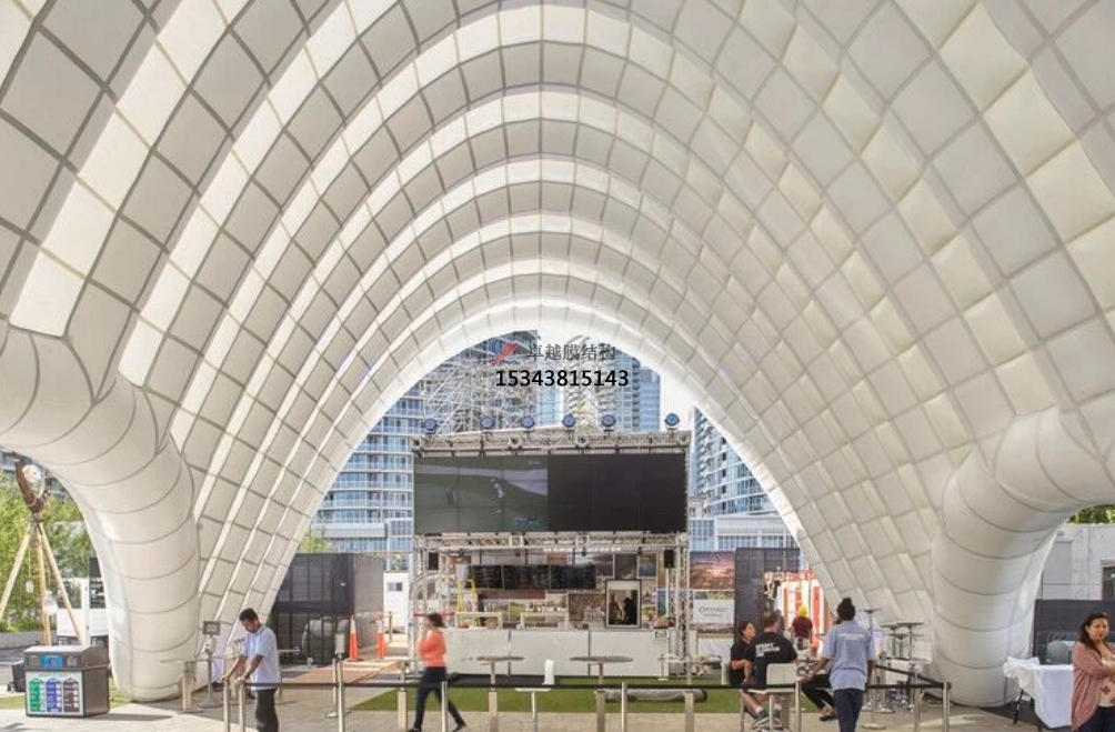 戶外充氣膜的核心結(jié)構(gòu)基于高強(qiáng)度的薄膜材料,通過內(nèi)部持續(xù)充氣產(chǎn)生壓力差,從而使膜體保持穩(wěn)定的形狀。這種薄膜材料通常具備出色的抗拉強(qiáng)度、抗紫外線性能以及耐候性,能夠抵御各種惡劣的自然環(huán)境。充氣膜的支撐系統(tǒng)相對簡潔,摒棄了復(fù)雜的鋼結(jié)構(gòu)或混凝土框架,僅依靠少量的錨固點(diǎn)與地面相連,大大簡化了施工過程,同時也降低了建筑成本。?