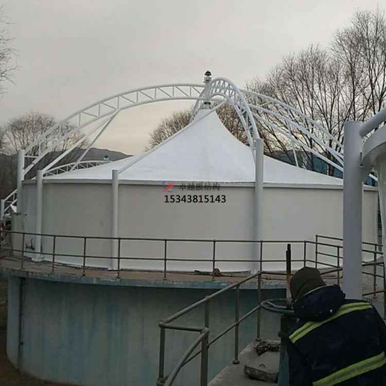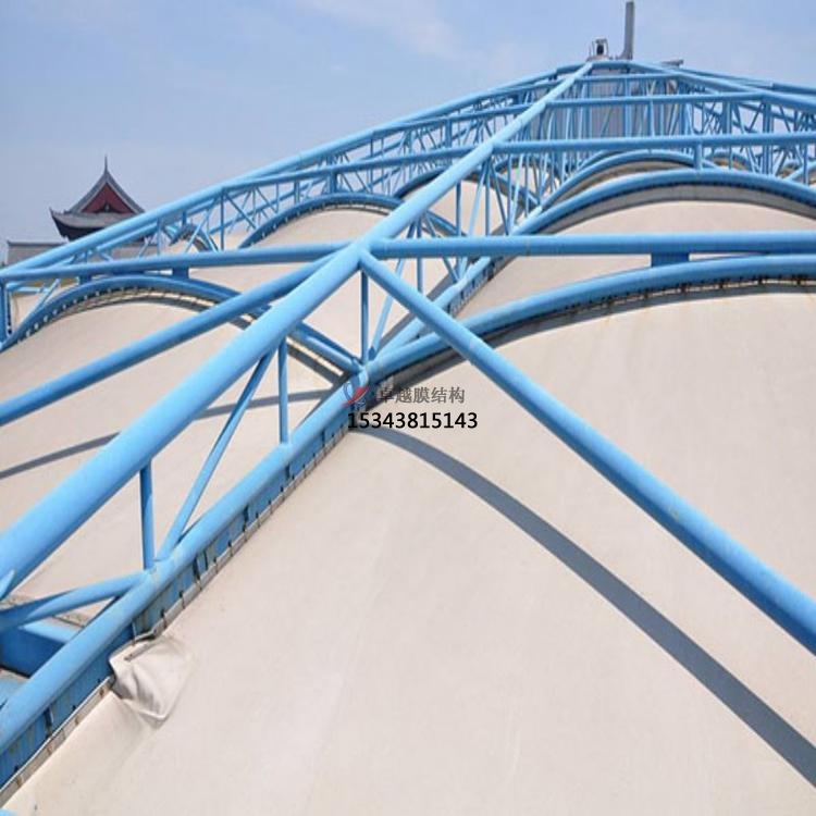 鋼架反吊膜結(jié)構(gòu)是專門用于污水池加蓋密閉的一種膜結(jié)構(gòu)形式,結(jié)構(gòu)形式新穎,防腐耐霉,由鋼結(jié)構(gòu)、膜結(jié)構(gòu)及安裝輔件構(gòu)成,根據(jù)不同污水池現(xiàn)場(chǎng)條件進(jìn)行個(gè)性化設(shè)計(jì)安裝。鋼結(jié)構(gòu)在外部形成穩(wěn)定受力結(jié)構(gòu),膜材料反吊與機(jī)構(gòu)內(nèi),隔絕廢氣對(duì)剛架構(gòu)的腐蝕。鋼架反吊膜分為圓形反吊膜和方形反吊膜,其中方形反吊膜又分為拱形及吊帽結(jié)構(gòu)。