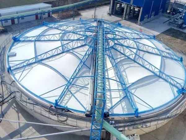 2、我公司利用膜結(jié)構(gòu)的輕巧,別致的造型建造各種半封閉,全封閉的不行空間;污水池反吊膜結(jié)構(gòu)中的高強度柔韌薄膜稱膜材,它是一種耐腐蝕、耐高溫、耐久用、高強度的樹脂類涂層織物,由多種復(fù)合PVC樹脂涂層刀刮成型,具有質(zhì)地柔韌、厚度小、重量輕、透光性好的特點。對自然光吸收和透射能力、阻燃,具有良好的耐久、防火、氣密等特性;表面經(jīng)過特氟龍?zhí)幚砘蚨趸伩估匣幚恚哂休^高的自清潔性能。下面就大家介紹一下我公司在泰安市地區(qū)完成的部分污水池膜結(jié)構(gòu)封閉項目。