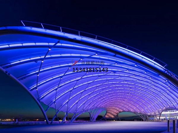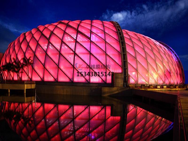 ETFE膜廠家更后通過氣枕制作過程包括膜片疊合及定位焊接、邊帶定位焊接、氣枕周邊焊接等工序。在氣枕周邊裝上夾具,將其固定在檢查專用的鋼架上。連接臨時充氣管,想氣枕內(nèi)部充入空氣,使其內(nèi)壓達(dá)到或超過實(shí)際工作壓力,并保持壓力一定時間。檢查氣枕的各焊縫的焊接強(qiáng)度及密封情況,并檢查氣枕的矢高是否符合設(shè)計要求。