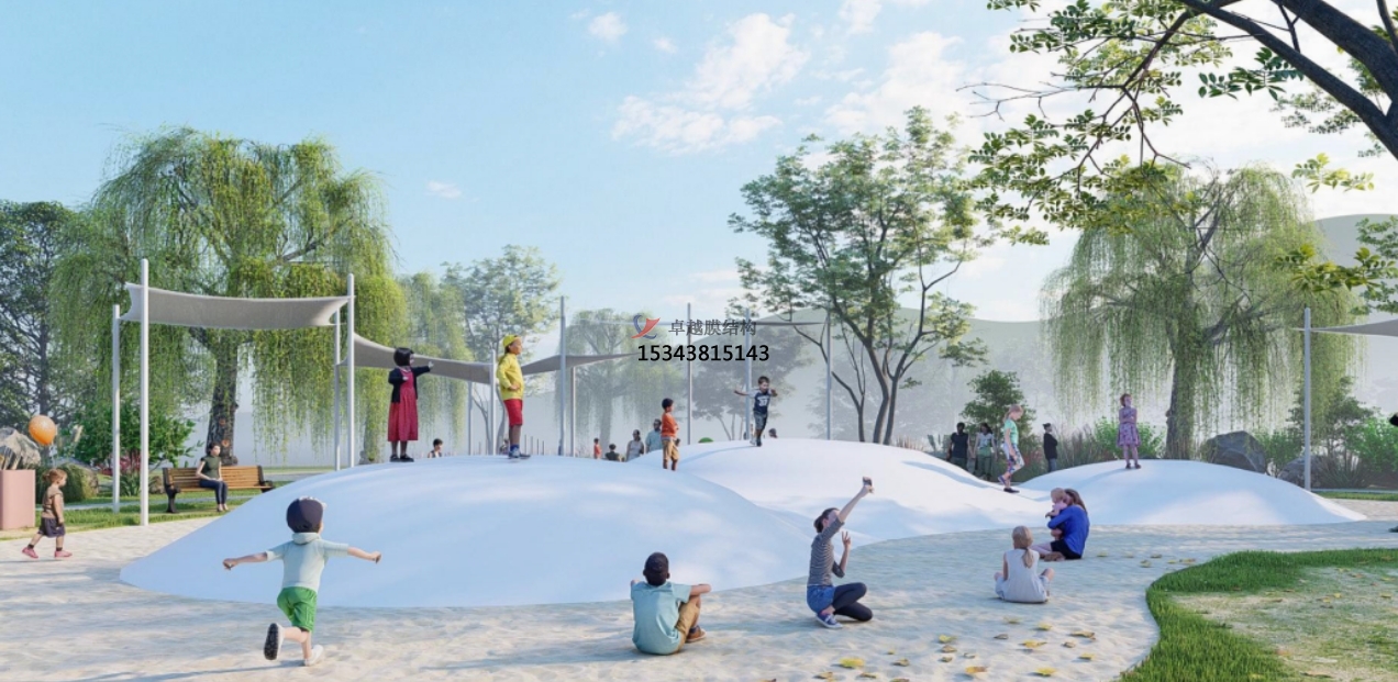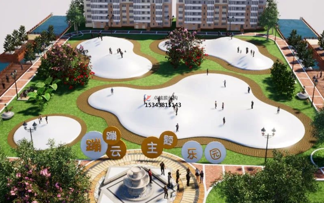 蹦蹦云的造型具有一定的吸引力。整體可以設(shè)計(jì)成單球、雙球、多球等錯(cuò)落分布,視覺(jué)上帶給人一定的沖擊。在顏色選擇上也可以選擇不一樣的顏色,與周圍環(huán)境區(qū)分開(kāi),更突出玩耍設(shè)備帶來(lái)的吸睛效果。