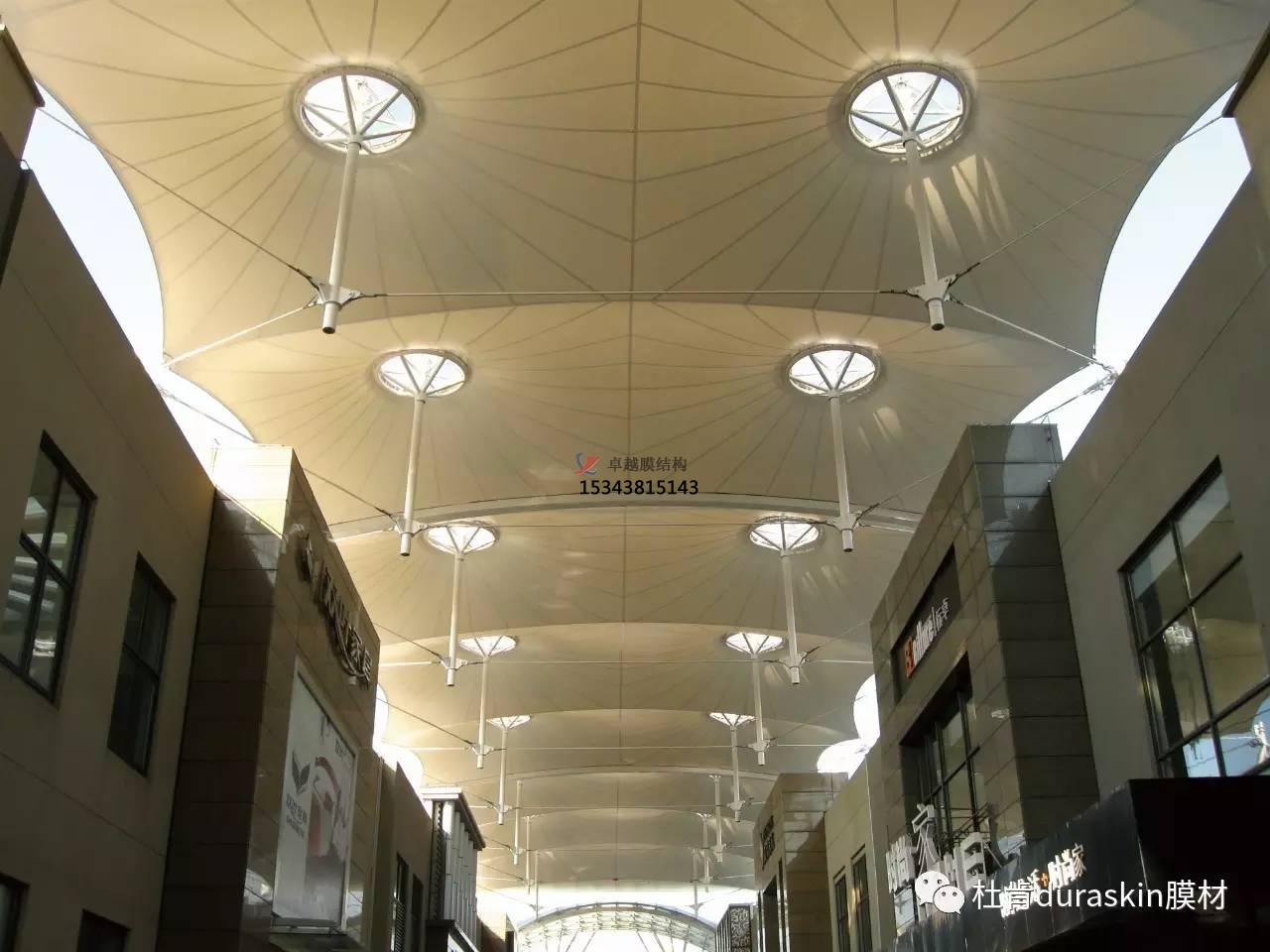建筑入口使城市公共空間與建筑空間相鄰的界面,成為城市空間的組成部分。它是人們視覺最先接觸的部分,因此,除了功能以外,還應(yīng)有很強(qiáng)的標(biāo)識性,并能體現(xiàn)建筑的個(gè)性,是建筑環(huán)境和城市景觀的重要組成部分。由于膜結(jié)構(gòu)自然的曲線美是其他結(jié)構(gòu)類型無法比擬的,故成為近來建筑入口及屋頂經(jīng)常采用的形式。